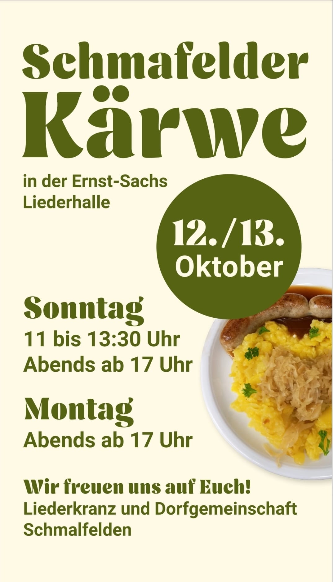 Zur Kirchweih in Schmalfelden bieten wir in der Ernst- Sachs- Liederhalle wieder eine reichhaltige Speisekarte.