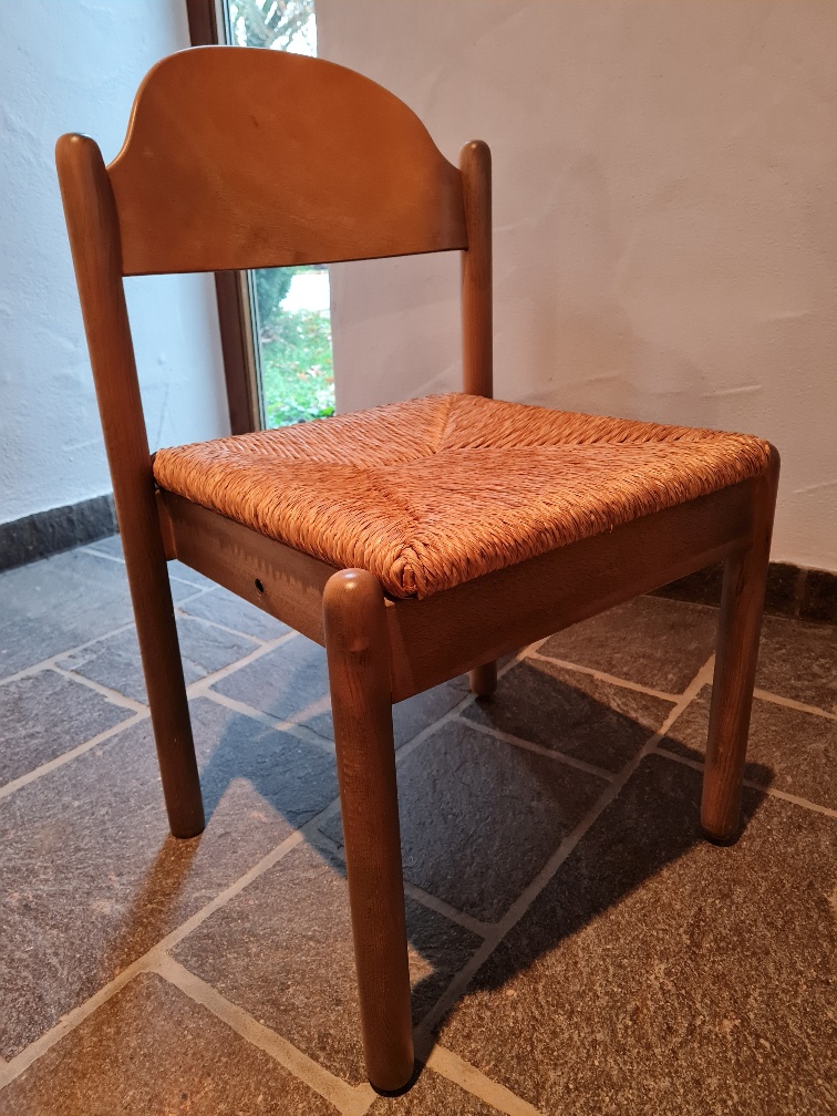 Die Stadt Schrozberg verkauft gebrauchte, stapelbare Holzstühle mit Rattangeflecht.
